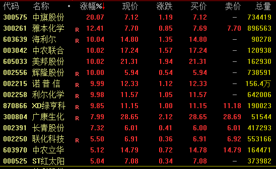 农药概念午后强势拉升,截至收盘,中旗股份(300575)20%涨停,雅本化学涨超12%,海利尔、中农联合、美邦股份、辉隆股份等涨停。